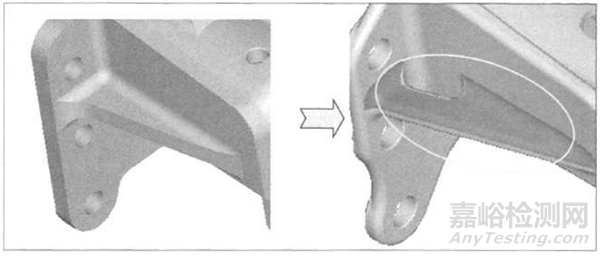 梯形筋是指外形近似梯形的筋,其功用一一剔除多余材料、消除鑄造熱節(jié),通常設置于零件拐角相交處。如圖9,為某客車板簧支架,在筋與板的相交處出現(xiàn)大的熱節(jié),易出現(xiàn)縮孔、縮松;通過開工藝孔形成梯形筋,在保證零件強度的前提下用料最少,且有效消除熱節(jié)。