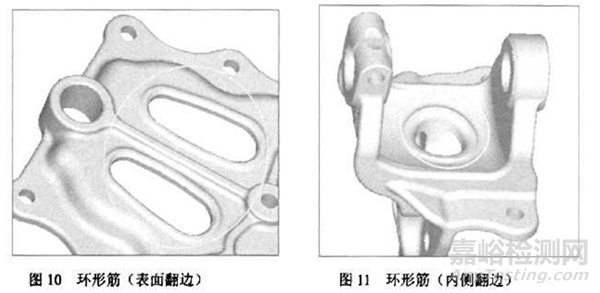 環(huán)形筋指結(jié)構(gòu)近似環(huán)形的筋,主要用于工藝孔、工藝槽翻邊加固,見圖10與圖11