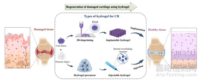 圖1 使用水凝膠進行軟骨組織再生的方法示意圖以及設計用于放置在膝關(guān)節(jié)損傷部位的不同水凝膠