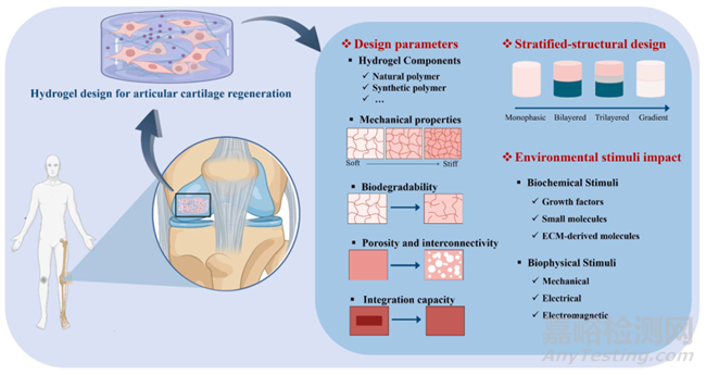 關(guān)鍵參數(shù),包括材料類型、機械強度、基質(zhì)剛度和彈性、生物降解性、完整性、孔隙率以及互連性,對于調(diào)控細胞命運至關(guān)重要,特別是在增殖和分化方面。這為研究開辟了廣闊的領(lǐng)域,以確定這些因素單獨或相互結(jié)合如何有助于更好地重建組織。然而,關(guān)于這一領(lǐng)域的基本處理參數(shù)的研究卻很少。當前的綜述文章為水凝膠在這一領(lǐng)域的研究提供了不同的視角。本綜述的主要目的是展示設計用于軟骨再生(CR)的水凝膠所涉及的關(guān)鍵因素的最新進展。以下部分涵蓋了水凝膠設計的參數(shù),包括水凝膠成分、機械性能、生物降解性、結(jié)構(gòu)設計和與相鄰天然組織的整合能力。本文首先全面概述了該領(lǐng)域的現(xiàn)有知識,強調(diào)了基于水凝膠的軟骨組織工程方法的挑戰(zhàn)和局限性。然后探討了水凝膠設計的最新進展和突破,第3節(jié)探討了模仿天然軟骨結(jié)構(gòu)的分層結(jié)構(gòu)水凝膠。接下來是討論環(huán)境刺激以及如何通過闡明水凝膠結(jié)構(gòu)之間的相互作用來設計它們以調(diào)節(jié)細胞反應和組織再生。圖2提供了整個綜述內(nèi)容的全面總結(jié)。本文旨在強調(diào)仿生水凝膠可以恢復關(guān)節(jié)軟骨的組成、結(jié)構(gòu)和生物力學功能。最后通過分享對水凝膠設計用于關(guān)節(jié)軟骨修復未來的看法來結(jié)束本文。這些進步在滿足尚未解決的臨床需求、提高軟骨相關(guān)疾病患者的生活質(zhì)量方面具有重大前景,從而直接影響聯(lián)合國可持續(xù)發(fā)展目標。