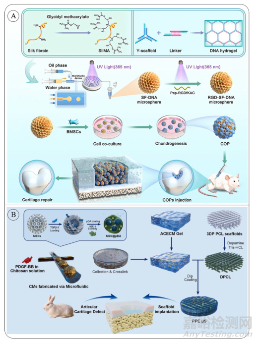 為了確保實際應用中的生物活性和生物相容性,用于水凝膠的聚合物可以來源于生物體內(nèi)的內(nèi)源性物質(zhì)。這些包括糖胺聚糖、大分子蛋白質(zhì)和DNA核苷酸。Zhao等人介紹了具有可調(diào)節(jié)表面硬度的DNA-SF DN水凝膠。這些水凝膠通過DNA堿基配對形成,并通過限制和聚集SF分子促進β-折疊結(jié)構(gòu)的形成。第二網(wǎng)絡是通過酶介導的SF交聯(lián)建立的。研究發(fā)現(xiàn),DNA-SF DN水凝膠在促進軟骨分化方面非常有效。在此基礎(chǔ)上,Shen等人開發(fā)了能夠裝載BMSCs的RGD-SF-DNA水凝膠微球(RSD-MSs)。首先,使用微流控技術(shù)、絲素甲基丙烯酸酯和超分子DNA水凝膠技術(shù)創(chuàng)建了SF-DNA DN水凝膠微球(SD-MSs)。然后通過光聚合技術(shù)對這些微球進行表面修飾,引入Pep-RGDfKA。結(jié)果表明,RSD-MSs是制造和維護長期軟骨類器官的理想選擇,為CR提供了一個創(chuàng)新的策略和生物材料選擇(圖3A)。