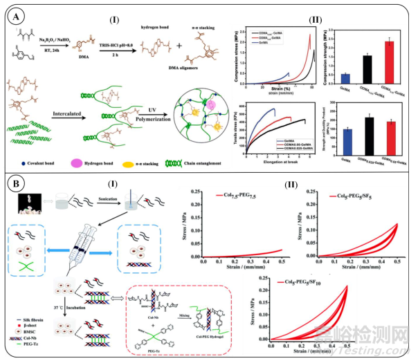 天然的關(guān)節(jié)軟骨(AC)具有獨特的機械性能,包括特定的壓縮強度、彈性模量和粘彈性行為。水凝膠支架的機械特性在提供適當?shù)闹С?、負荷分布和功能性方面起著至關(guān)重要的作用,這些都是成功進行CR所必需的。許多研究專注于調(diào)節(jié)水凝膠的機械性能以模擬天然軟骨的特性。與常規(guī)水凝膠不同,關(guān)節(jié)軟骨既堅硬又堅韌,而常規(guī)水凝膠在機械力的作用下會變形,且缺乏軟骨修復所需的必要屬性。更常見的是,通過犧牲吸收和保留凝膠水分的能力來實現(xiàn)硬化過程,這可能會通過阻礙細胞遷移和生物分子擴散來損害嵌入細胞的存活能力。此外,它們的脆性抑制了力分布,降低了潤滑功能。然而,孔徑大小、溶脹比、強度和韌性等參數(shù)可以在不犧牲硬度的情況下得到改善。Gan等人通過將多巴胺甲基丙烯酸酯低聚物摻入GelMA中開發(fā)了一種水凝膠,與單網(wǎng)絡GelMA水凝膠相比,該水凝膠在機械性能上具有兩個關(guān)鍵優(yōu)勢。首先,GelMA鏈之間距離的增加提高了水凝膠的失效應變。其次,多巴胺創(chuàng)建了一個次級交聯(lián)網(wǎng)絡,在負載下通過物理犧牲鍵耗散能量(見圖4A)。當前的努力集中在開發(fā)既能保持硬度又能分散能量以防止在受損區(qū)域集中力量的堅韌水凝膠上。一種有前景的軟骨修復方法涉及使用多種聚合物和交聯(lián)機制,每種都有其特定用途。