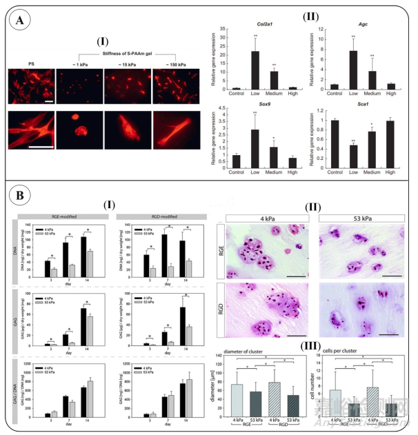 基質(zhì)彈性可以決定干細胞的命運或譜系承諾。在較硬的基質(zhì)上,MSCs、成纖維細胞和內(nèi)皮細胞都表現(xiàn)出了改善的細胞粘附、擴散和增殖。如前所述,天然凝膠由于其調(diào)整機械性能的能力有限,并不理想用于研究軟骨細胞對需要精確控制剛度的基質(zhì)的力學感應。通過改變交聯(lián)類型、復合材料的濃度比例、外部刺激、分子量以及添加納米顆粒(NPs),研究人員創(chuàng)建了可調(diào)剛度的水凝膠。Kwon和Yasuda開發(fā)了磺酸鹽涂層的聚丙烯酰胺(S-PAAm)凝膠,其彈性模量分別為1, 15和150 kPa。培養(yǎng)在高剛度凝膠上的MSCs顯示出強烈的應力纖維表達,而那些在低剛度凝膠上的細胞則呈現(xiàn)出圓形,具有更多的皮質(zhì)肌動蛋白。值得注意的是,較低剛度的凝膠即使沒有分化補充劑也導致了更高的軟骨生成標記物(Col 2a1, Agc, Sox9)的mRNA水平(圖5A)。Lin等人通過調(diào)整PEG-二丙烯酸酯(PEGDA)前體的分子量從3.4到20 kDa,創(chuàng)建了具有不同機械性能的水凝膠。較高分子量的PEGDA增加了水凝膠的溶脹比和網(wǎng)格大小。PEGDA-6 kDa和-10 kDa水凝膠在第四周時具有最高的糖胺聚糖(GAG)含量,而PEGDA-20 kDa則有更高的膠原蛋白含量。PEGDA-10 kDa顯示出最高的II型膠原過度表達。Schuh等人使用經(jīng)過RGD修飾的瓊脂糖水凝膠獨立研究了基質(zhì)剛度、粘附位點密度和孔隙率的影響。無論基質(zhì)的剛度如何或粘附位點的可用性如何,細胞都保留了軟骨生成表型。通過定量測定發(fā)現(xiàn),經(jīng)RGD和RGE(精氨酰-甘氨酰-谷氨酰)修飾的較軟凝膠中的GAG和DNA含量顯著更高。然而,每個DNA的GAG含量不受基質(zhì)剛度或粘附位點可用性的影響。根據(jù)蘇木精和伊紅(H&E)染色,較軟凝膠中細胞ECM簇的平均直徑顯著大于較硬凝膠中的直徑(圖5B)。
