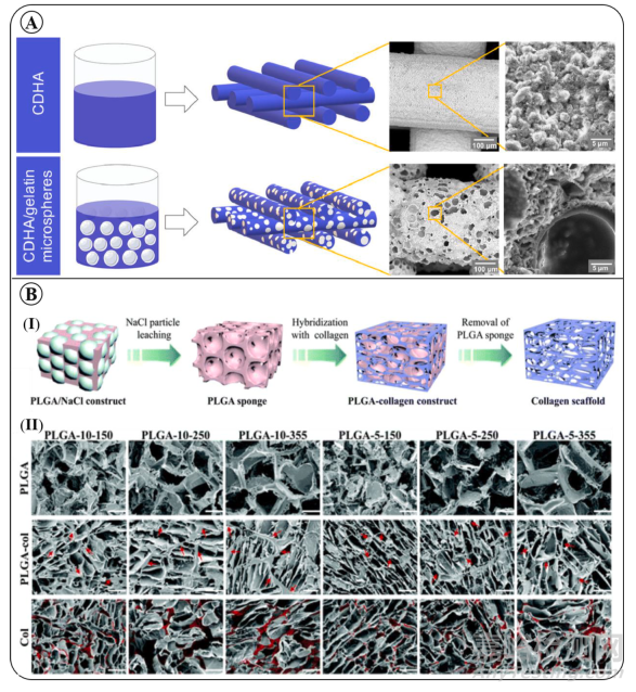 優(yōu)化水凝膠支架的孔隙性和連通性可以通過多種方法實現(xiàn)。一種方法是犧牲模板法,即將某種材料引入水凝膠中,隨后去除該材料以形成孔隙。例如,Konka等人在羥基磷灰石支架中使用了Gel微球,從而形成了適合組織工程的多孔結(jié)構(gòu)(圖6A)。另一種方法是顆粒瀝濾法,即在水凝膠中分散水溶性顆粒,然后溶解這些顆粒以形成孔隙。此外,還使用PLGA海綿作為模板來創(chuàng)建具有連通孔隙的Col支架。這些支架支持均勻的軟骨細胞分布、快速的細胞分裂以及增加的軟骨基因表達和細胞外基質(zhì)分泌。最有效的結(jié)果是使用高重量比和大鹽顆粒的PLGA海綿作為模板的Col支架(圖6B)。