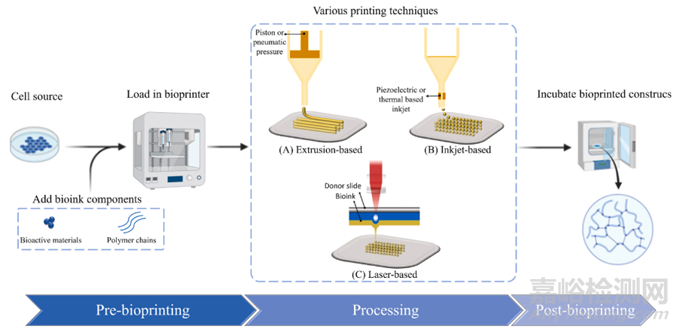 為了創(chuàng)建大孔結(jié)構(gòu),已經(jīng)開發(fā)了各種其他方法,包括3D打印、凍干法、氣體發(fā)泡、聚合物相分離以及乳化液滴或聚合物微球。在眾多3D生物打印策略中,擠出式打印、噴墨式打印和激光生物打印是最常用的(圖7)。每種方法都有其優(yōu)缺點,例如成本、精度和時間效率。這些標準3D生物打印技術(shù)的主要區(qū)別在于它們對微觀幾何結(jié)構(gòu)的精確控制能力。在打印之前,CAD軟件系統(tǒng)設計3D模型并設置參數(shù)。不同的墨水和方法需要特定的參數(shù)。水凝膠墨水被混合并放置在墨水儲存盒中,然后由3D打印機逐層應用到構(gòu)建平臺上。每一層硬化后,再添加下一層,逐步構(gòu)建起3D水凝膠前體,最后將其連接在一起。然而,在空中打印軟質(zhì)生物材料可能導致變形和形狀喪失。為解決這一問題,自由可逆嵌入懸浮水凝膠(FRESH)技術(shù)在具有屈服應力的支持浴中打印生物墨水,該支持浴在生物墨水固化前將其固定住。該方法涉及將打印的水凝膠嵌入作為臨時性、熱可逆性和生物相容性的第二水凝膠中。