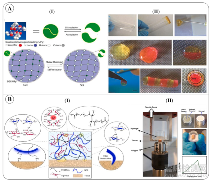 可注射水凝膠以其易于給藥和對刺激的響應性而聞名,通過均勻分散細胞和生物分子并填充不規(guī)則的組織缺陷,促進與周圍軟骨的整合。調(diào)整凝膠時間對于強整合至關(guān)重要;它既不應過長以避免材料流動,也不應過短以免影響整合??勺⑸渌z也用于治療復雜的疾病如骨關(guān)節(jié)炎,其剪切稀化特性防止細胞沉降。Hou等人將脲嘧啶酮(UPy)單元摻入DEX聚合物中,創(chuàng)建了一種剪切稀化的水凝膠,由于動態(tài)氫鍵作用,在幾分鐘內(nèi)就能整合兩種嵌入軟骨細胞和BMSCs的水凝膠(見圖9A)。