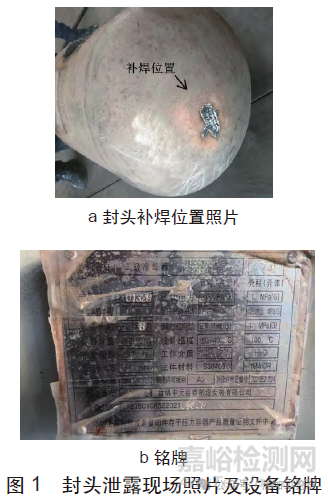 公司生產的某批次共計6 只規(guī)格為EHA400*12的S30403封頭在交付客戶使用兩年后,其中2只封頭在服役過程中發(fā)生開裂泄露。該批次封頭生產工藝如下:鋼板切圓-680T冷沖壓成型-坡口-研磨-酸洗-交付。客戶對泄露的封頭進行滲透探傷確定泄漏位置后,將泄漏位置外壁進行打磨和補焊處理(如圖1a所示),補焊所用焊絲熔敷金屬材質為E308L-16。由設備銘牌可知(如圖1b所示),封頭內工作介質中存在HCl等富Clˉ的化合物。
