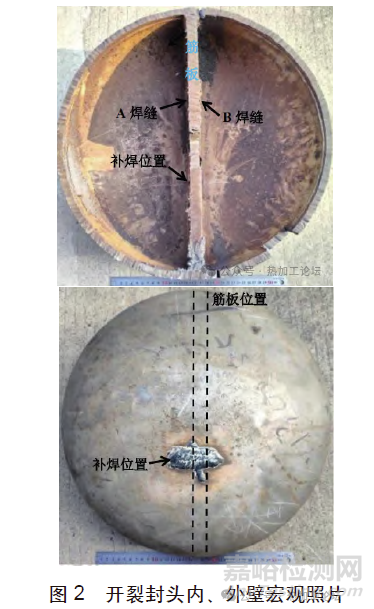 為查明其開裂原因,對其中1只開裂封頭進行宏觀形貌、化學成分、機械性能、耐腐蝕性能、斷口形貌、金相組織進行檢測及分析。