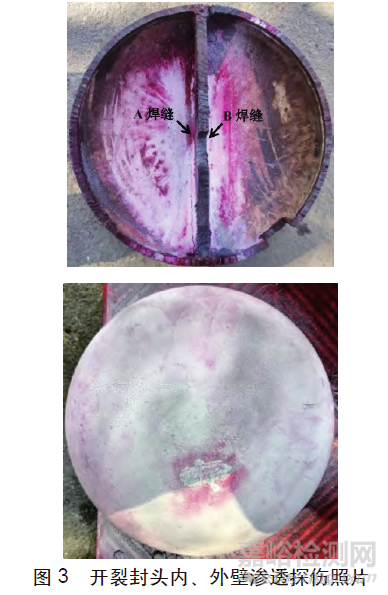 圖2為封頭內、外壁表面宏觀照片,封頭內壁中間存在一塊筋板,筋板根部與封頭內壁通過兩側的角焊縫連接,封頭內壁存在大量紅褐色銹蝕產物,觀察發(fā)現(xiàn),封頭外壁補焊焊縫恰位于筋板根部與封頭的角焊縫處。對該封頭進行探傷檢查,以確認其內壁表面開裂泄漏位置,圖3為開裂封頭內、外壁表面以及封頭內壁筋板根部兩側角焊縫區(qū)域滲透探傷照片,封頭外壁表面未見滲透探傷顯影缺陷,封頭內壁筋板根部兩側角焊縫中A焊縫在焊縫與筋板的焊趾處存在兩處較明顯的滲透探傷顯影缺陷,且其中一處顯影缺陷(1#顯影缺陷)恰位于補焊位置,B焊縫顯影缺陷不明顯。