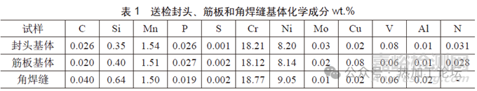 對封頭、筋板和角焊縫基體取樣進行化學成分檢查,結果見表1,封頭和筋板基體化學成分均符合GB/T 24511—2017中S30403技術規(guī)范,角焊縫基體化學成分符合角焊縫焊絲熔敷金屬技術規(guī)范。