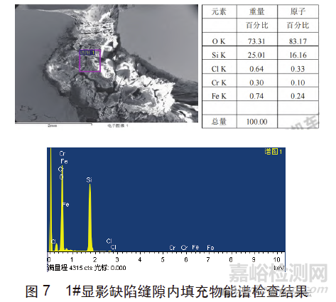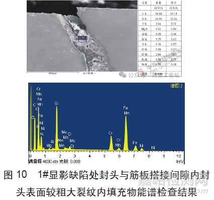 圖7為封頭1#顯影缺陷縫隙內填充物能譜檢查結果,其主要由O、Si元素組成,腐蝕性介質元素Cl含量也較高,這與其工作介質中元素組成相符。圖8為封頭1#顯影缺陷截面金相組織,1#顯影縫隙缺陷開口較大,缺陷處筋板表面幾乎與筋板母材表面平行,且其表面組織為奧氏體,與母材組織基本一致,焊縫側表面組織為奧氏體+條狀和枝晶狀鐵素體,為典型的奧氏體不銹鋼焊縫組織,焊縫側表面還存在較多絮狀小裂紋,這與其工作介質中存在腐蝕性介質元素Cl有關,1#顯影縫隙缺陷具有焊接未熔合缺陷特征。