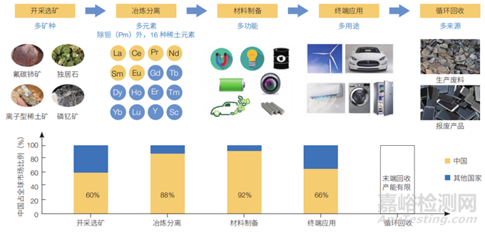 中國稀土產(chǎn)業(yè)鏈各階段在全球市場中的占比