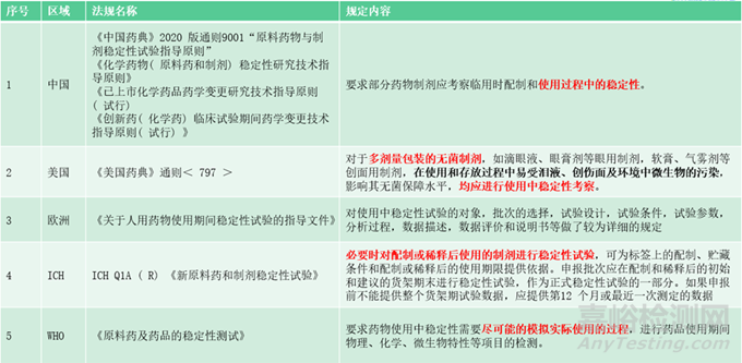 筆者查閱了國內(nèi)外使用中穩(wěn)定性研究要求,各國對藥物使用穩(wěn)定性研究比較重視,均頒布了相關(guān)法規(guī)或指導(dǎo)原則對藥物使用中穩(wěn)定性研究進(jìn)行指導(dǎo)。