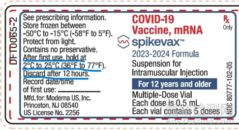 示例1:FDA批準(zhǔn)的新冠疫苗(多劑量),明確規(guī)定啟封后應(yīng)在2-25℃貯藏,如超過12h應(yīng)丟棄。