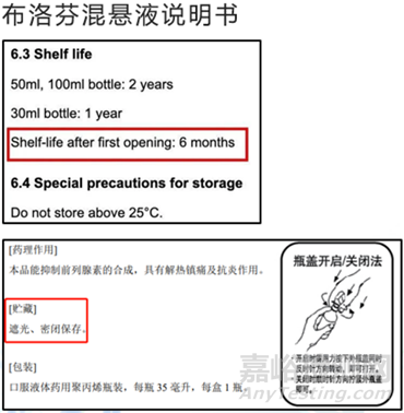 示例2:以布洛芬混懸液為例,說明書中明確規(guī)定,貯藏在25℃以下的室溫,啟封后6個(gè)月內(nèi)可使用。