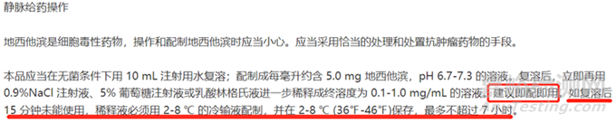 示例3:注射用地西他濱說明書中明確規(guī)定,使用前需復(fù)溶、稀釋,如果15min內(nèi)未使用,需將稀釋液至2-8℃儲藏,不得超過7h。