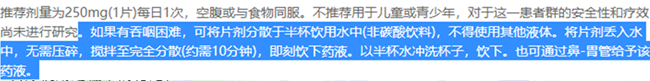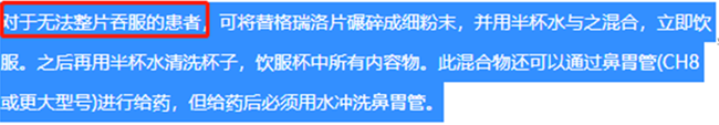 示例4:替格瑞洛片說明書規(guī)定,對于吞咽困難的患者,可將藥片碾碎,與水混合服用。