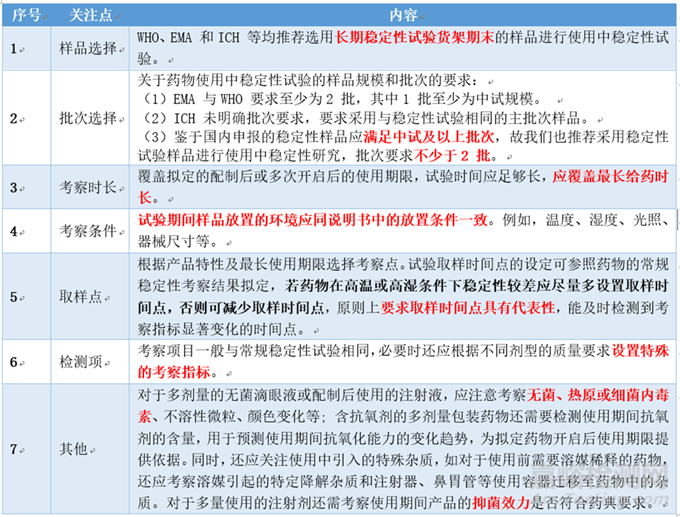 由于不同藥物的劑型、規(guī)格、儲存條件、用法用量等不同,使用中穩(wěn)定性試驗(yàn)研究也存在差異,在進(jìn)行試驗(yàn)設(shè)計(jì)時(shí)需具體問題具體分析。雖然存在差異,但基本原則是一致的:應(yīng)根據(jù)產(chǎn)品的包裝形式、環(huán)境條件、使用方法、、使用數(shù)量、使用時(shí)間等,讓使用中穩(wěn)定性試驗(yàn)盡可能模擬實(shí)際使用的過程,同時(shí)應(yīng)涵蓋最差使用條件。筆者整理了,使用中穩(wěn)定性試驗(yàn)主要關(guān)注點(diǎn),見下表。