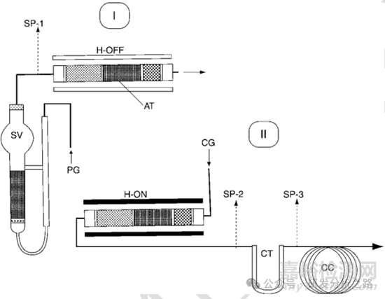 系統(tǒng)工作在兩個(gè)狀態(tài)之下,捕集和解析。圖中狀態(tài) 1 為捕集狀態(tài),氣體(PG)吹掃樣品管(SV)中的液體或固體樣品,揮發(fā)性的 目標(biāo)物質(zhì)被吸附在捕集阱(AT)內(nèi)。理論上待測(cè)組分大部分被吸附到捕集阱內(nèi),所以分析靈 敏度比頂空要高的多。狀態(tài) 2 為解析狀態(tài),此時(shí)捕集阱加熱,目標(biāo)物質(zhì)析出后被氣相色譜的載氣推動(dòng)進(jìn)入色譜柱。圖中的 CT 為冷阱,作用是二次解析,使得色譜峰更加尖銳,狀態(tài) 2 與熱解吸進(jìn)樣器是相同的。