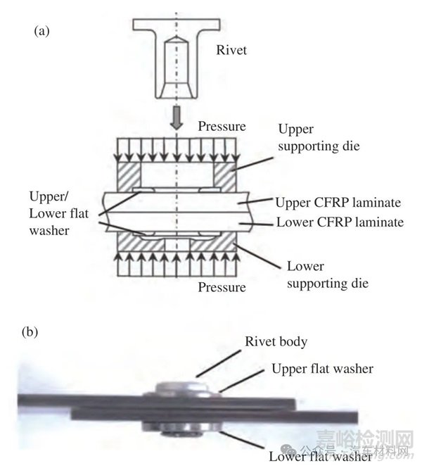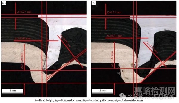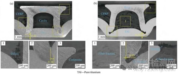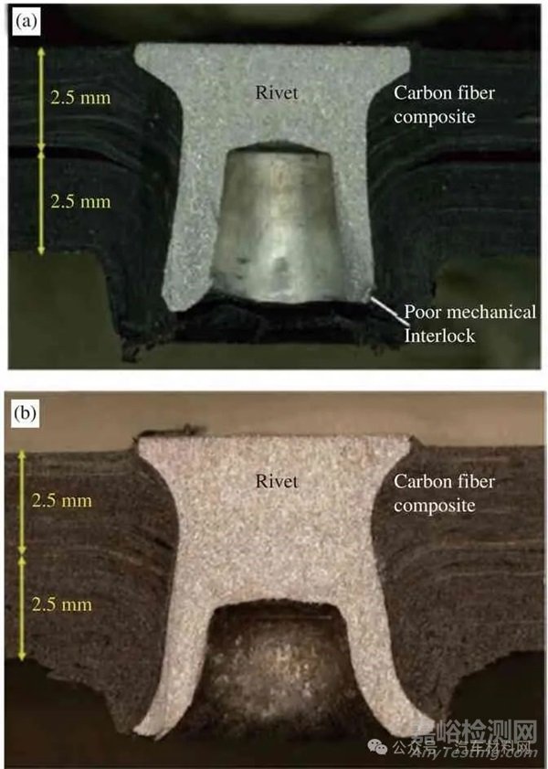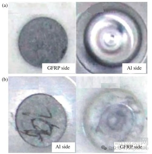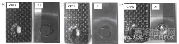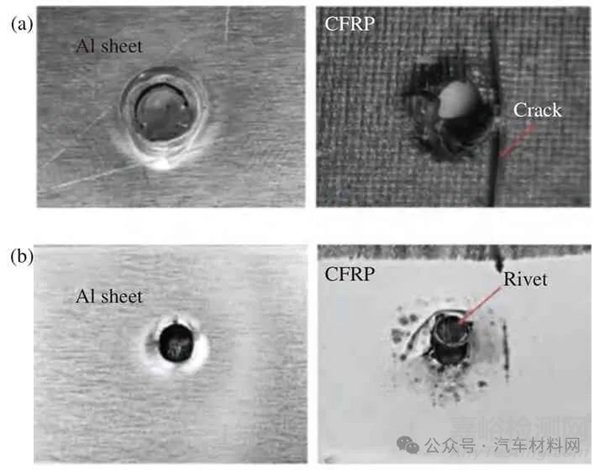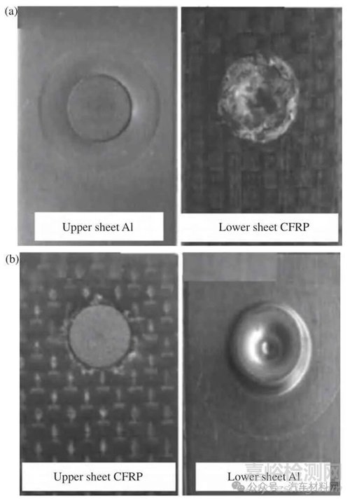 圖4 熱固性樹脂基碳纖維復合材料(CFRP)連接順序?qū)宇^的影響[30]:(a) CFRP 為下板;(b) CFRP 為上板