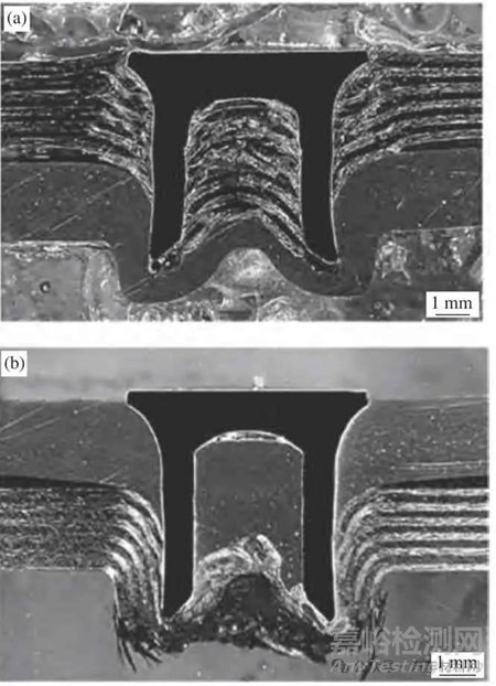 圖14 電磁自沖鉚(a)與傳統(tǒng)壓鉚(b)接頭剖面結構對比[45]