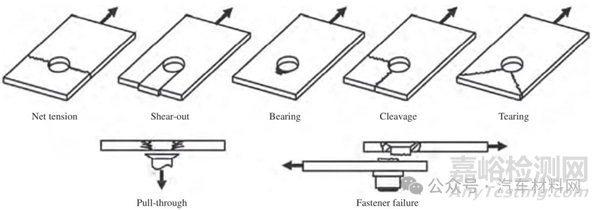 在不同基體類型的復合材料中,樹脂基復合材料的應用最廣泛,自沖鉚連接的研究也主要集中在樹脂基復合材料,下文若無特殊說明,復合材料專指樹脂基復合材料。復合材料自沖鉚工藝研究的主要方向有接頭靜強度、疲勞性能[23]、耐蝕性研究[24]、載荷下接頭的破壞演進及失效模式研究[21]、鉚釘和接頭結構設計及工藝優(yōu)化等[22]。接頭主要破壞失效形式有拉伸破壞(Net tension)、剪切破壞(Shear-out)、擠壓破壞(Bearing)、劈裂破壞(Cleavage)、撕裂破壞(Tearing)、拉脫破壞(Pull-through)和鉚釘剪斷破壞(Fastener failure) [25],如圖3 所示,其中,純拉伸、純剪切、擠壓、劈裂和撕裂破壞都是基板受到來自鉚釘?shù)睦?、剪切或者混合應力作用,發(fā)生撕裂或變形導致的接頭破壞,而其中最理想的接頭失效形式為擠壓破壞,發(fā)生擠壓破壞的接頭一般具有漸進失效的特點和良好的能量吸收性能[26],十分適用于汽車車身構件的連接;拉脫破壞形式是指鉚釘從上基板或下基板中脫出分離,是最常見的一種接頭破壞形式;自沖鉚鉚釘一般為高強鋼或不銹鋼材料,因而鉚釘剪斷破壞這種失效形式較少見[21]。實際的接頭失效通常是上述若干種破壞形式的組合,例如拉脫破壞前通常會伴隨擠壓破壞或剪切破壞等。