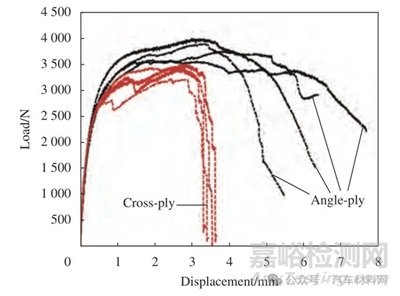 圖9 交叉鋪層和多角度鋪層CFRP 材料接頭載荷-位移曲線[42]