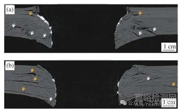 然而,也有研究發(fā)現(xiàn),沖鉚速度并非越高越有利,當電磁自沖鉚設備的放電能量在4.9~5.9 kJ(放電能量決定其沖鉚速度)范圍內(nèi)變化時,隨著放電能量提升,底切厚度(圖15 中的Δt3)顯著提升,機械內(nèi)鎖作用增強,但同時釘頭余高(圖15中的Z)隨著沖鉚速度的增加而逐漸減小,鉚釘高度方向能夠承受載荷的尺寸降低,接頭強度在達到極值后出現(xiàn)下降,對比發(fā)現(xiàn),自沖鉚設備放電能為5.5 kJ 時,接頭性能最佳[46]。Rao 等[47-48]通過CFRP-鋁合金板空心自沖鉚試驗印證了上述結論,通過控制沖鉚速度以調(diào)整釘頭余高,當釘頭余高為0.03 mm 時,接頭的最大拉伸剪切載荷相比于釘頭與上基板面平齊的情形(沖鉚速度較高,余高為0)提升了43%(增加了1 200 N),且疲勞性能也有一定的改善;X 光掃描圖片顯示,沖鉚速度越高,接頭附近的碳纖維堆疊、纖維或基體斷裂(圖16 中淺色箭頭) 和層間分裂(圖16 中深色箭頭)等材料損傷情況更加嚴重,材料內(nèi)損傷在受載荷時則成為斷裂裂紋擴展的源頭,這也是導致接頭靜態(tài)強度和疲勞性能降低的主要原因。