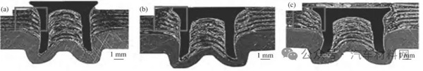 圖17 沖鉚壓力對接頭結構的影響 [44]:(a) 703.3 N;(b) 803.8 N;(c) 904.3 N