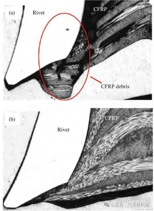 圖21 常規(guī)自沖鉚(a)與后固化自沖鉚(b)工藝接頭殘余CFRP 堆積對比[43]