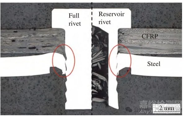 Fig.28 Influence of rivet structure on joint damage[57]: (a) Reservoir rivet; (b) Tolerance reservoir rivet