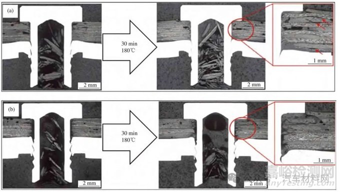圖20 常規(guī)自沖鉚(a)與后固化自沖鉚(b)工藝接頭損傷對比[43]