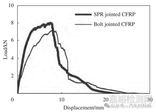 Fig.9 Load-displacement curves of SPR joints with CFRP cross-ply and CFRP angle-ply [42]