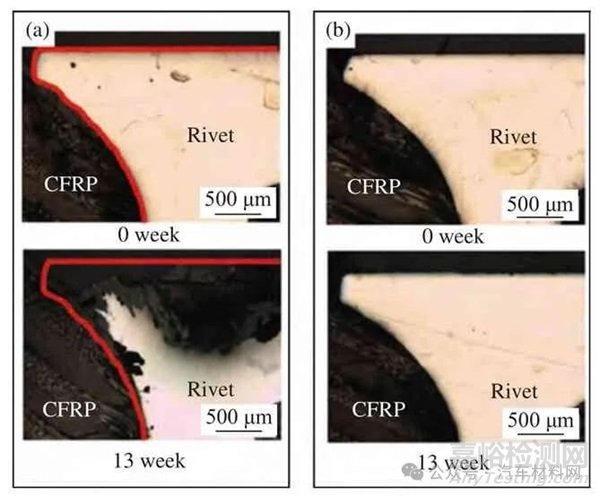 為保證自沖鉚接頭強度和鉚接過程的順利刺穿,鉚釘通常采用高強鋼材質(zhì),而鋼的耐蝕性能相比鋁合金和復合材料較差,特殊工作環(huán)境下接頭強度和壽命會受到鉚釘耐蝕性能的影響[61]。Karima 等[24] 分別采用Almac@鍍層(Zn-Sn-Al 鍍層)和Zn-Ni 鍍層的高強鋼鉚釘連接CFRP-5052 鋁合金,并將接頭置于鹽霧室內(nèi)進行13 周的加速腐蝕試驗,結果顯示,Almac@鍍層鉚釘由于其和復合材料之間的強電位差(0.93 V),鉚釘頭部質(zhì)量腐蝕損傷了約46%,如圖32(a)所示,其對接頭的壓緊和約束能力顯著降低,導致接頭強度下降了22.8%,接頭失效形式也由腐蝕前的鉚釘頭尾同時從上下基板拔出,轉(zhuǎn)變?yōu)獒旑^從上基板拔出;而Zn-Ni 鍍層與復合材料間的電位差較低,接頭腐蝕后鉚釘質(zhì)量基本無損失,如圖32(b)對比所示,接頭強度僅下降了6.9%。