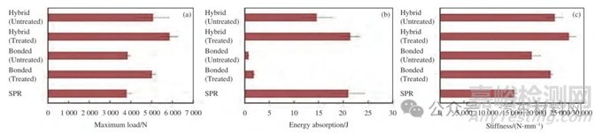 圖36 不同連接工藝接頭最大載荷(a)、能力吸收值(b)和剛度(c)對比[42]