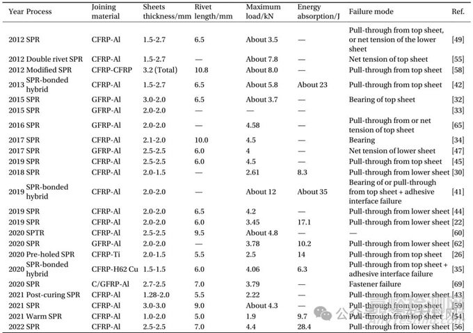 復合材料和輕質(zhì)高強金屬相結合的混合材料車身結構使用成為汽車輕量化的重要途徑,復合材料之間及其與異質(zhì)材料間的有效連接則是混合材料車身制造的關鍵環(huán)節(jié)。自沖鉚工藝以其優(yōu)質(zhì)高效的特點,在復合材料連接中展現(xiàn)出優(yōu)勢和良好適用性,得到了廣泛的關注和研究??偨Y近年來復合材料自沖鉚連接的研究成果發(fā)現(xiàn):復合材料與鋁合金薄板自沖鉚接頭強度多集中在4 kN 上下,強度值范圍可以與金屬板件間的自沖鉚接頭相媲美;而影響接頭性能的主要因素有母材性能、鉚釘結構、鉚接工藝參數(shù)及服役條件等;改善接頭性能的關鍵在于提升復合材料板的強度、降低復合材料內(nèi)部鉚接損傷缺陷及改善釘腳與下板的機械內(nèi)鎖結合性能;此外,自沖鉚接頭復合以膠接工藝,能夠顯著提升接頭的綜合性能。
