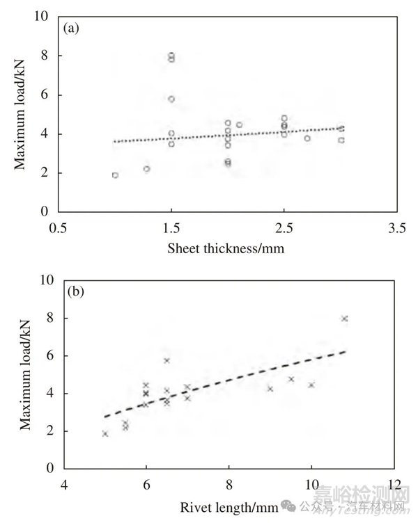 Fig.38 Statistical law of joint strength in Table 1: (a) Maximum load and composite sheet thickness; (b) Maximum load and rivet length