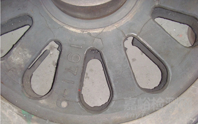 在輪心檢修中,通過磁粉探傷,分析磁痕可知,裂紋包括輪心出廠時(shí)遺留鑄造缺陷或輪心經(jīng)補(bǔ)焊出現(xiàn)的焊接裂紋,以及在輻板孔周圍的徑向裂紋,初步分析后者為鑄造裂紋的進(jìn)一步擴(kuò)展。