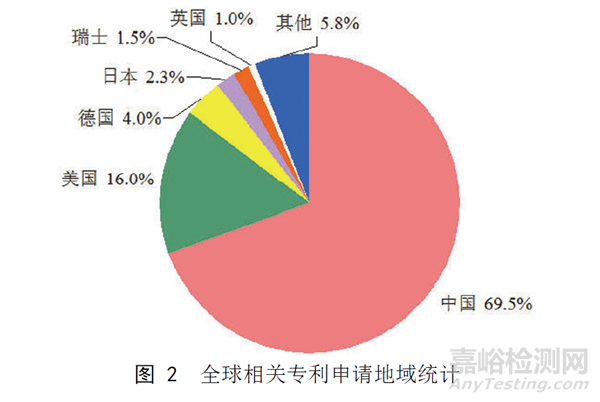 圖1為全球血管支架用可降解聚合物領(lǐng)域的專利申請量趨勢圖。從圖中可以看出,2000 年以后,隨著經(jīng)濟技術(shù)的不斷發(fā)展以及科研工作者的不斷努力,全球的血管支架專利技術(shù)發(fā)展迅速,該領(lǐng)域的研發(fā)投入持續(xù)增長,血管支架全球需求不斷擴大。自2007年專利申請量增長漸緩,總體布局基本形成,且一直維持在較高水平,呈現(xiàn)出非常良好的發(fā)展前景。