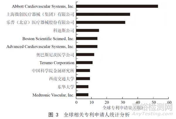 圖2和圖3分別為全球相關(guān)專利申請的地域統(tǒng)計分析和申請人統(tǒng)計,從中可以看出,申請量前 5 的國家分別為中國、美國、德國、日本和瑞士。申請人主要包括企業(yè)申請人和高校申請人,國外申請人中申請量排名第一的是美國雅培公司,國內(nèi)則是上海微創(chuàng)醫(yī)療器械(集團)有限公司。