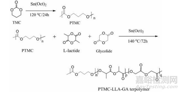 CN106589336A公開了一種PTMC-LLA-GA共聚物支架,先利用三亞甲基碳酸酯(TMC)開環(huán)聚合制備相對柔性的 PTMC 大分子預(yù)聚物,再與左旋丙交酯(LLA)、乙交酯(GA)進行開環(huán)無規(guī)聚合,TMC 單元的引入,使得該共聚物降解產(chǎn)物的酸性降低,并且通過加入不同含量的GA 單元可以調(diào)控共聚物的體內(nèi)降解速度。