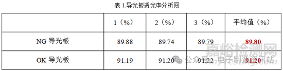 對(duì)NG導(dǎo)光板和OK導(dǎo)光板的透光率分別進(jìn)行分析,從表1可見(jiàn)NG導(dǎo)光板的透光率相對(duì)OK導(dǎo)光板偏低。