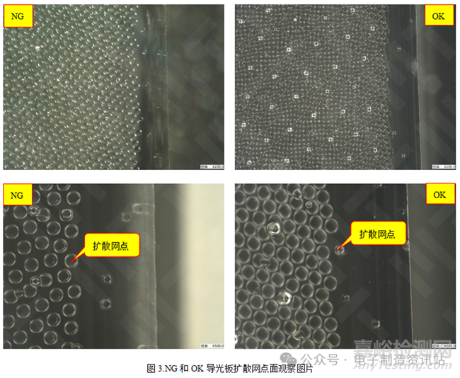 繼續(xù)對(duì)NG和OK導(dǎo)光板擴(kuò)散網(wǎng)點(diǎn)面進(jìn)行觀察,從圖3可見(jiàn):NG擴(kuò)散網(wǎng)點(diǎn)比較稀疏,OK擴(kuò)散網(wǎng)點(diǎn)比較稠密,兩者無(wú)明顯本質(zhì)差別。