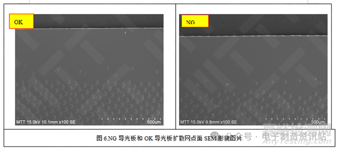 對(duì)NG和OK導(dǎo)光板發(fā)黃邊緣進(jìn)行觀察發(fā)現(xiàn),NG導(dǎo)光板表面附一層物質(zhì)(異物),而OK導(dǎo)光板比較光滑,如圖4所示。未明顯發(fā)黃區(qū)域,兩者導(dǎo)光板表面均比較粗糙,如圖5所示。對(duì)兩者導(dǎo)光板擴(kuò)散網(wǎng)點(diǎn)面進(jìn)行觀察,兩者無(wú)明顯差別,如圖6所示。