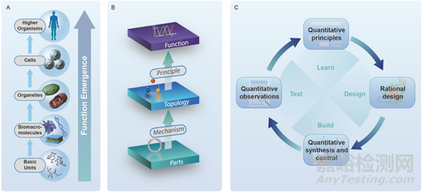 圖1 通過(guò)定量合成生物學(xué)理解功能出現(xiàn)。A,在生命系統(tǒng)的層次組織中出現(xiàn)的功能,僅通過(guò)了解單個(gè)部分是無(wú)法理解的。B,方法論的層次結(jié)構(gòu)。C,定量合成生物學(xué)研究中的原則和合理設(shè)計(jì)相互促進(jìn)。所提出的定量合成生物學(xué)研究范式整合了合理設(shè)計(jì)、構(gòu)建和測(cè)試。