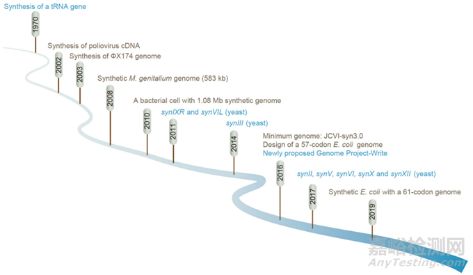 圖2 合成基因組學(xué)里程碑。棕色代表在病毒和細(xì)菌基因組合成方面的進(jìn)展。藍(lán)色表示在真核生物基因組合成方面的里程碑。