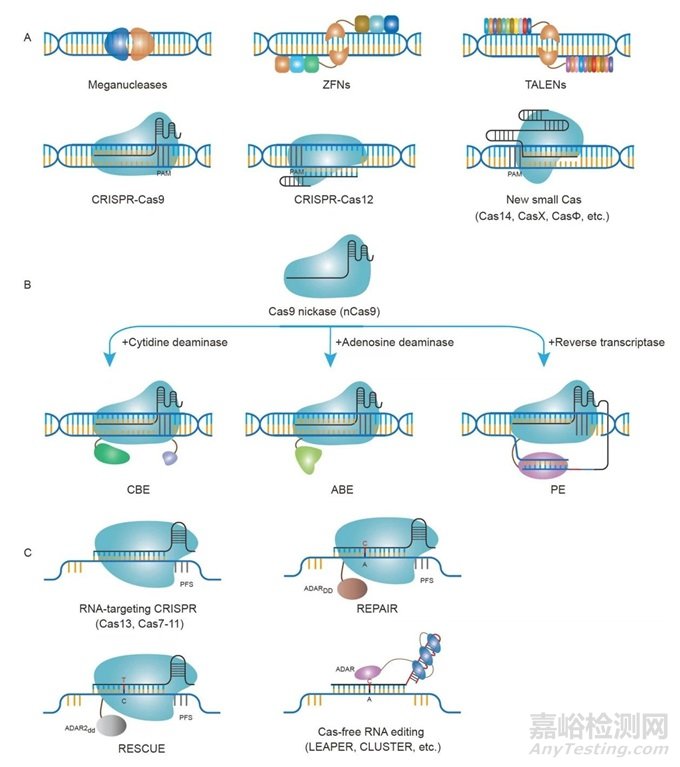 圖4 基因組編輯技術(shù)的概覽。A, 基于核酸酶的基因組編輯技術(shù),針對(duì)DNA,包括巨型核酸酶、ZFNs(鋅指核酸酶)、TALENs(轉(zhuǎn)錄激活因子效應(yīng)子核酸酶)、CRISPR-Cas9、CRISPR-Cas12以及新的小型Cas變體。B, 精確DNA基因組編輯技術(shù),包括胞嘧啶堿基編輯器、腺嘌呤堿基編輯器和首要編輯器。C, RNA編輯技術(shù),包括CRISPR-Cas13、CRISPR-Cas7-11,以及像REPAIR、RESCUE等RNA堿基編輯方法和其他無(wú)Cas的RNA編輯方法。
