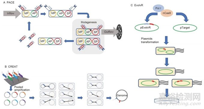 最近,已經(jīng)開(kāi)發(fā)了許多有前景的技術(shù)用于體內(nèi)蛋白質(zhì)進(jìn)化(圖5)。這些方法通過(guò)將突變酶或核酸酶定位到DNA中,直接在宿主生物體內(nèi)生成多個(gè)隨機(jī)突變。CRISPR/Cas9開(kāi)創(chuàng)了基因組編輯的新時(shí)代,也已應(yīng)用于蛋白質(zhì)工程。EvolvR系統(tǒng)由Cas9-nickase和連續(xù)在gRNAs的指導(dǎo)下產(chǎn)生可調(diào)窗口中突變的錯(cuò)誤傾向DNAP I組成。更具體地說(shuō),一種新的體內(nèi)突變方法,CRISPR-Enabled Traceable Genome Engineering(CREATE),利用CRISPR/Cas9系統(tǒng)和條形碼跟蹤盒突變多個(gè)位點(diǎn)并跟蹤它們。它可以為整個(gè)蛋白質(zhì)序列形成單堿基庫(kù),構(gòu)建一個(gè)飽和庫(kù),其中每個(gè)氨基酸殘基都被替換。噬菌體輔助順序進(jìn)化(PACE)是另一種體內(nèi)進(jìn)化策略。它利用M13噬菌體在大腸桿菌中突變基因的生存能力。一般來(lái)說(shuō),PACE可以進(jìn)化任何與基本噬菌體基因表達(dá)相關(guān)的蛋白質(zhì)。由于噬菌體生命周期的快速代時(shí)間,一天內(nèi)可以在沒(méi)有人為干預(yù)的情況下進(jìn)行數(shù)十輪進(jìn)化。此外,由于T7 RNA聚合酶對(duì)DNA的結(jié)合親和力,它被用于幾個(gè)體內(nèi)蛋白質(zhì)進(jìn)化系統(tǒng)中。MutaT7是一種包含T7 RNA聚合酶和胞嘧啶脫氨酶的嵌合蛋白,可以編輯或突變T7啟動(dòng)子下游的特定基因。最近,基于T7 RNA聚合酶的定向體內(nèi)多樣化(TRIDENT)已經(jīng)開(kāi)發(fā)出來(lái),它基于T7 RNA聚合酶的進(jìn)化平臺(tái),利用增加的突變多樣性和更高的體內(nèi)突變率。