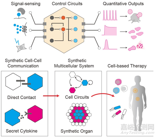 無(wú)論是使用傳統(tǒng)的生物工程還是當(dāng)前的合成生物學(xué),設(shè)計(jì)具有有益功能的細(xì)胞都面臨著相當(dāng)?shù)奶魬?zhàn)。在合成生物學(xué)時(shí)代,工程細(xì)胞的一個(gè)標(biāo)志是強(qiáng)調(diào)在系統(tǒng)和定量層面設(shè)計(jì)和重建非自然的細(xì)胞行為,這通常需要多個(gè)組件形成具有特定拓?fù)浣Y(jié)構(gòu)和功能的交互網(wǎng)絡(luò)。這些可設(shè)計(jì)的生物網(wǎng)絡(luò)由大分子組成,如蛋白質(zhì)、DNA、RNA或每個(gè)細(xì)胞內(nèi)的任何遺傳部分,稱為基因回路。值得指出的是,這樣的網(wǎng)絡(luò)可以在邏輯上超越單細(xì)胞層面,換句話說(shuō),通過(guò)直接或間接的細(xì)胞間接觸或通信形成互動(dòng)的多細(xì)胞系統(tǒng),稱為細(xì)胞回路。