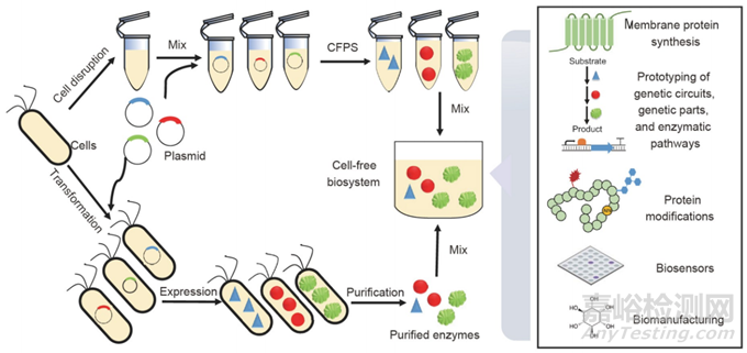 無(wú)細(xì)胞生物系統(tǒng)用于蛋白質(zhì)合成由粗細(xì)胞提取物、DNA模板、ATP再生系統(tǒng)、氨基酸、核苷酸、輔因子和緩沖液組成。可以根據(jù)要求選擇來(lái)自大腸桿菌、釀酒酵母、小麥胚芽、兔網(wǎng)織紅細(xì)胞、昆蟲細(xì)胞和中國(guó)倉(cāng)鼠卵巢細(xì)胞的幾種細(xì)胞提取物。該系統(tǒng)可用于合成毒性或膜蛋白、生物功能原型設(shè)計(jì)、蛋白質(zhì)修飾和生物傳感器。